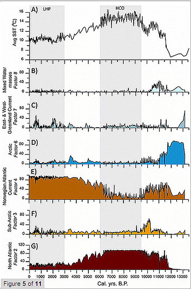 A paper published online yesterday in the journal Paleoceanography shows Nordic sea surface temperatures were as much as 6C higher than the present during the Holocene Climate Optimum (~ 9500 to 6000 years ago) and a “general cooling trend” over the past 7000 years. The paper finds changes in solar energy impacting the Earth (solar insolation) explain the natural cycles of cooling and warming seen in the proxy reconstruction. The study results clearly show no correlation with CO2 levels and once again demonstrate how the Sun controls climate, not CO2.